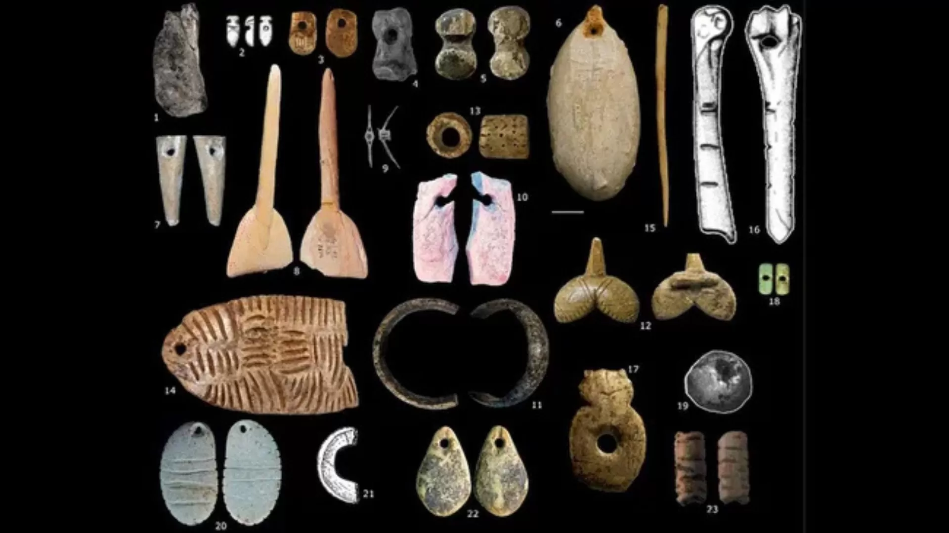 | Zaman Prasejarah | Gigi binatang, kerang, batu alami |